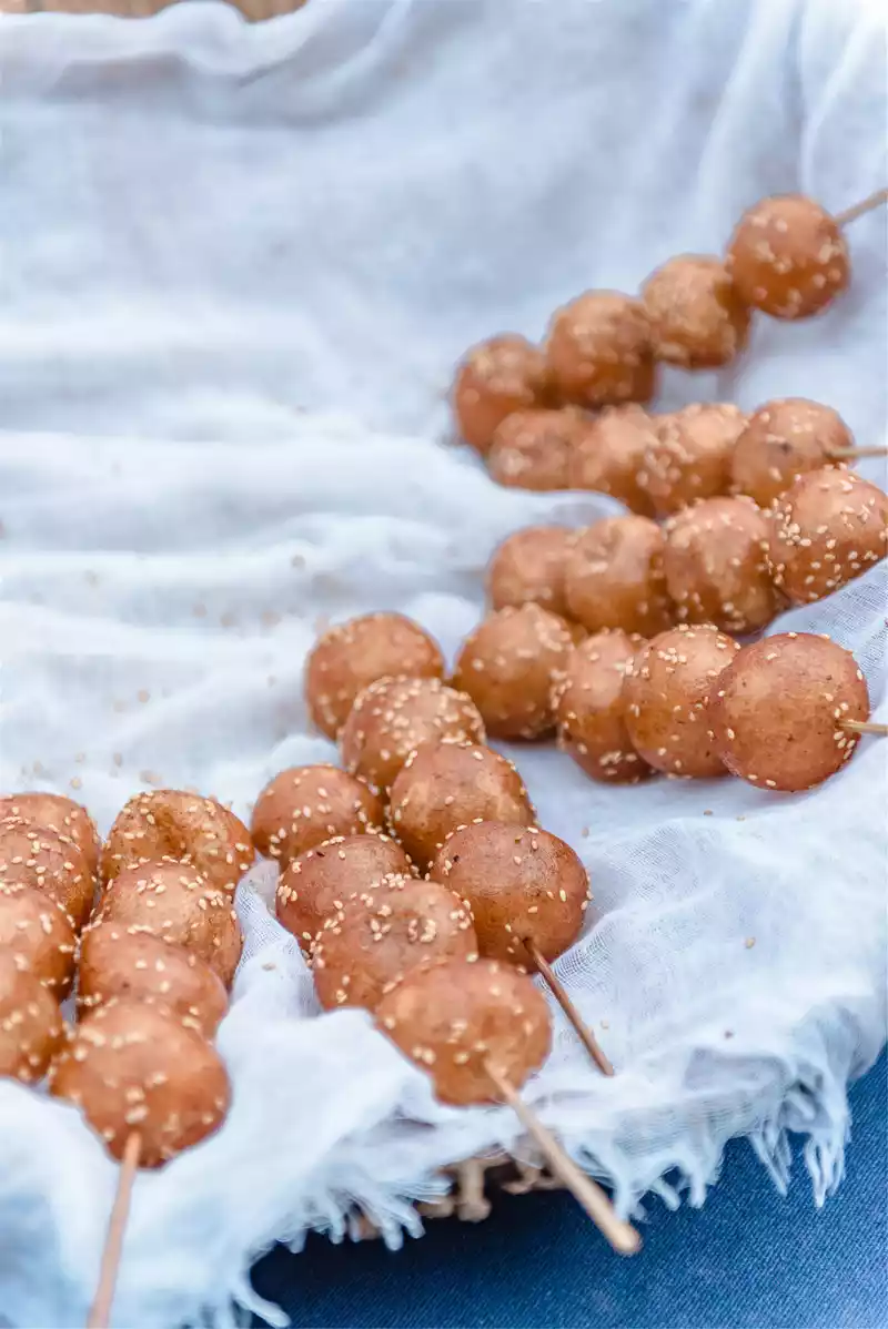 fried fruit is lying in the basket, still with the heat when it first came out of the pot, and the layer of sesame seeds wrapped outside exudes a burst of attractive fragrance, It looks really good with the blue base fabric.