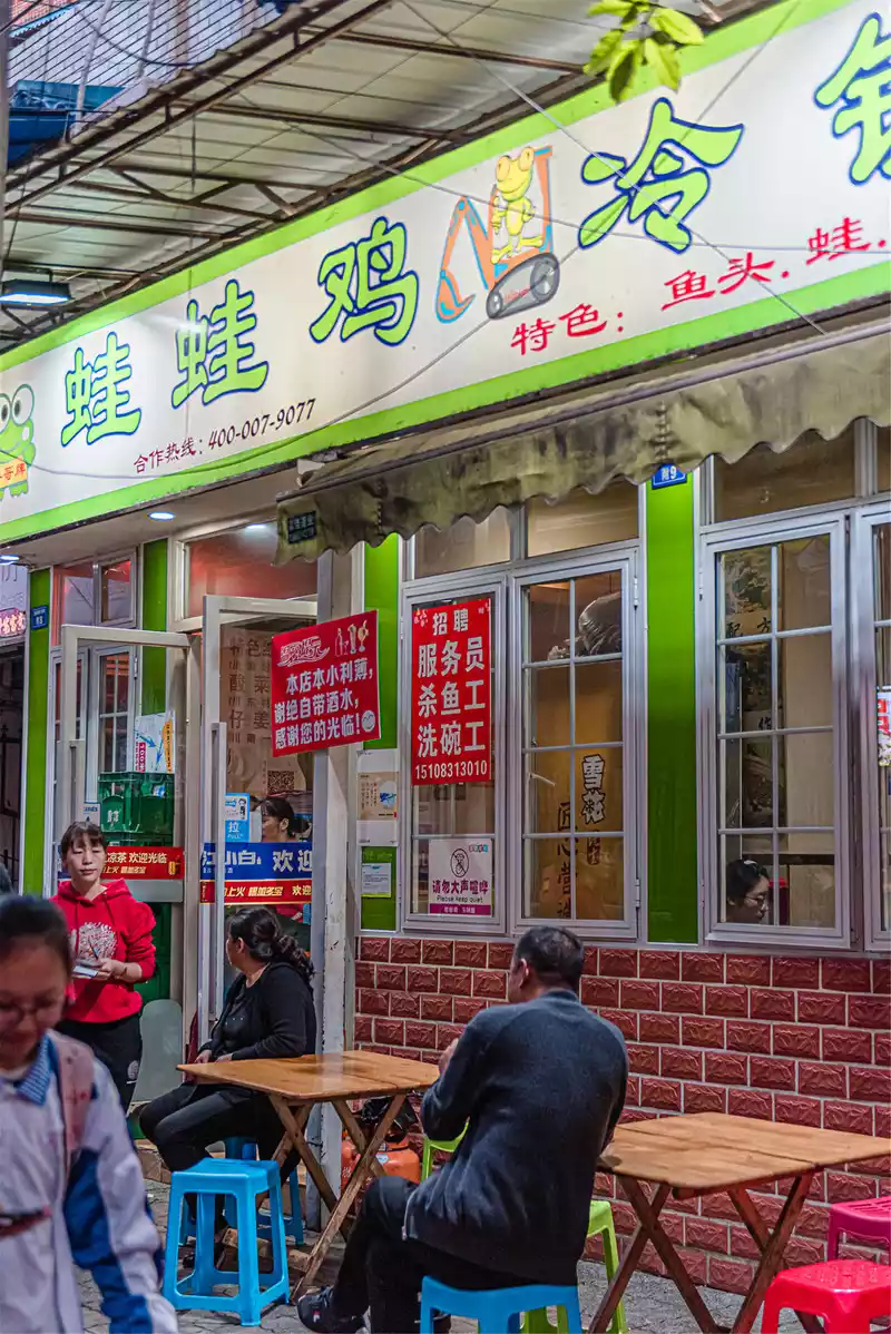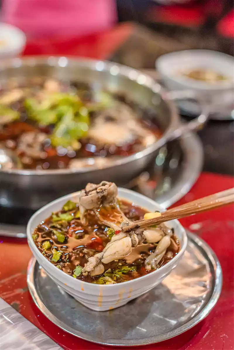 It is estimated that after six o'clock, people will fill the restaurant one after another with a mouthful of Chengdu dialect, and the business here is booming, which can be seen. The speed of serving is still very fast, the pot full of clear chili oil is soaked in the frog and the spicy fish, and the spicy molecules seduce people's appetite with a unique atmosphere under the mixture of side dishes.