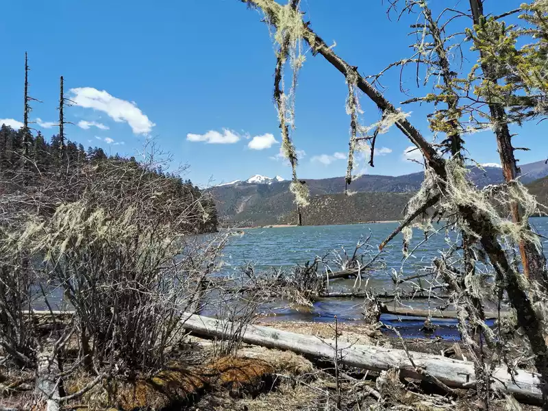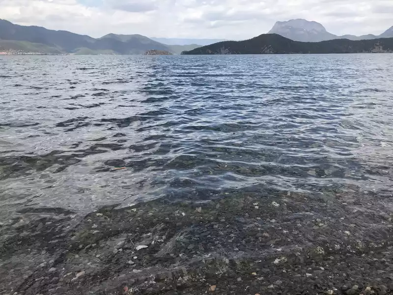 Lugu Lake Lugu Lake Goddess Bay, there are homestays, wooden boats, and Gemu Goddess Mountain (opposite). After May, there are still water-based poplars all over the lake, and the lake is shining with starlight and white flowers, but unfortunately, the sky is not warm enough, only dead branches float in the water, and you can't see it. Take a boat to the center of the lake, and you can directly take the water from the lake to drink.