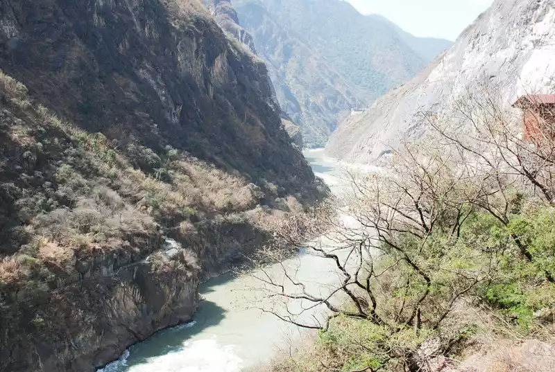 Tiger Leaping Gorge (Lijiang Section) The path between the mountain walls on the opposite bank is the former ancient tea horse road