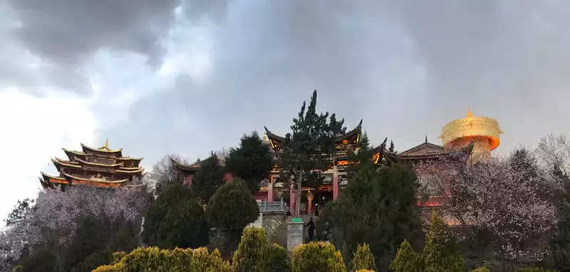 Dukezong Ancient City In the evening, on the top of Guishan Park in the ancient city of Dukezong, Chaoyang Tower + the world's largest prayer wheel.