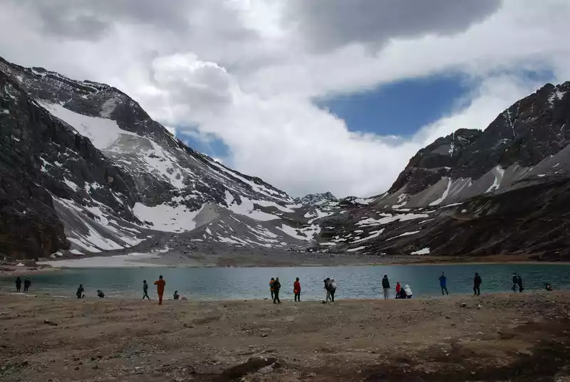 Milk Sea, Tibetan name "Russian Rongcuo", 4,600 meters above sea level, in the mountain hollow of Yangmaiyong Snow Mountain, in the shape of a scallop, because of the blue snow water in the middle, It is named after a circle of milky white water, which is an ancient glacial lake, shaped like a water droplet, surrounded by snow-capped mountains.