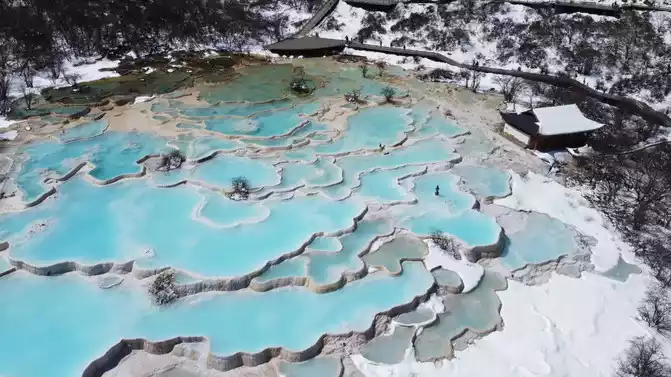 Huanglong's altitude is relatively high, and the drone consumes electricity faster. Since it is the dry season, there is almost no water in other scenes except for the colorful pond, but because it snowed for a week before we went, we should look at the snow scene.