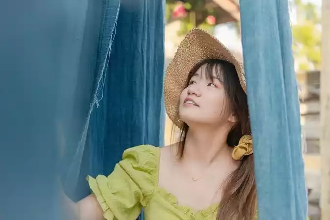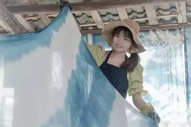 are many "indigo" studios in Mingyue Village, and "Aoi" and "Arashi Dyeing" are quite popular. In the "Lan Dyeing" workshop, there is an eldest sister who inherits intangible cultural heritage, smiling and guiding the frightened tourists standing in front of the dyeing vat every day.