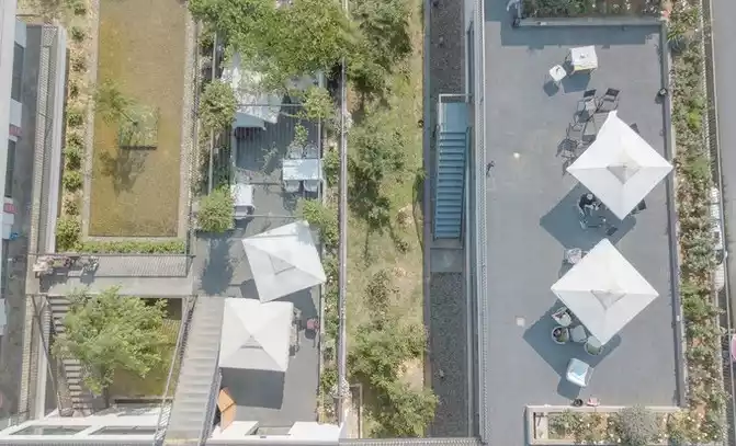 The beauty of the cherry orchard, in the "sky", is unremarkable, but when you climb to the connected roof, you look back and find that it is wonderful - at the end of April, the flowers on the branches have almost fallen, and the tea garden has also picked one stubble after another, and the remaining dark green and the white walls of the cherry orchard have become a minimalist outline of gongbi painting.