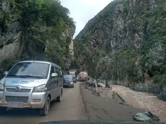 At 4 p.m., we crossed the Jinsha River Bridge and entered Zhubalong Township on the Tibetan border, 71 kilometers away from Mangkang County, with a time limit of 2 hours. At this point, the bad road began, and it was also the beginning of the nightmare, because the traffic police said when the collar was tied: It is good to be able to get to Mangkang at ten o'clock in the evening, and I thought it was impossible after hearing it. The first 30 kilometers of road were rotten, but smooth, and at 17:40 they were blocked in an unknown canyon due to the landslide, that is, there was no WeChat signal or mobile phone signal. The drivers spontaneously worked together to clear the blockage, which lasted for more than 2 hours, and it was getting dark and it was raining again.