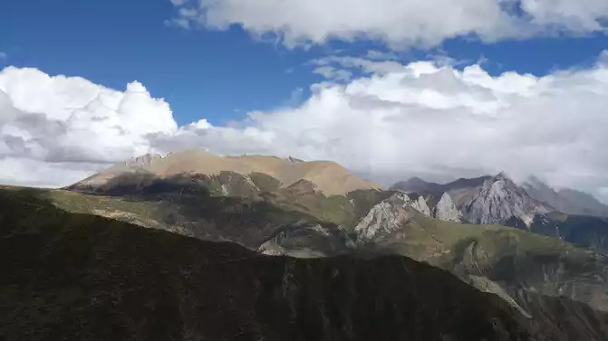 Crossing Rabbit Mountain (4,696 meters above sea level) and Haizi Mountain (4,602 meters above sea level), the scenery from Litang to Daocheng is pleasant, and the white clouds in the sky are much larger than marshmallows. The vegetation along the way is not dense, you can see some shallows, the mountain road is winding no matter how fast it is, and the road construction is still dusty in some places. When driving and encountering Tibetans driving the yaks, you must slow down and drive slowly, otherwise you will get into trouble.