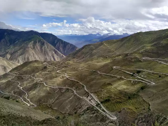 Yela Mountain Pass (4658 meters above sea level), there is an observation deck to see the Nu River 72 turns, also known as the Yela Mountain 99 turns, is the most spectacular devil's road in China, the winding zigzag winding mountain road runs through the natural moat between the Lancang River and the Nu River, these turns are steep and steep, are U-shaped bends.