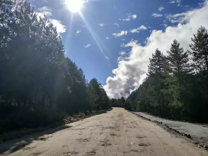 The car is driving between the mountains, the newly built asphalt road has not yet faded, the blue sky and white clouds intersect and shine, you can bathe in this scene, all the glitz has receded, I only wish to become one with this divine nature.