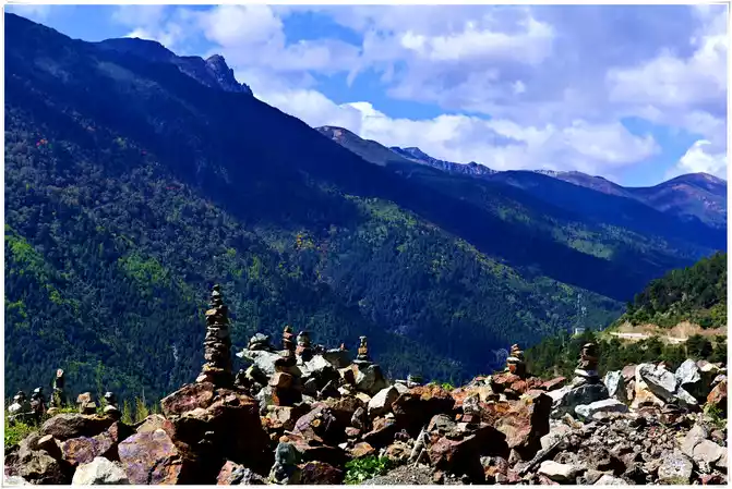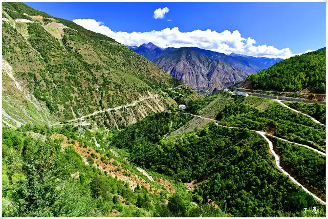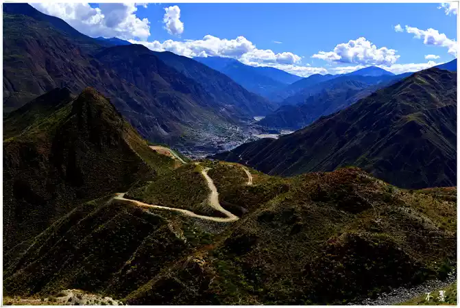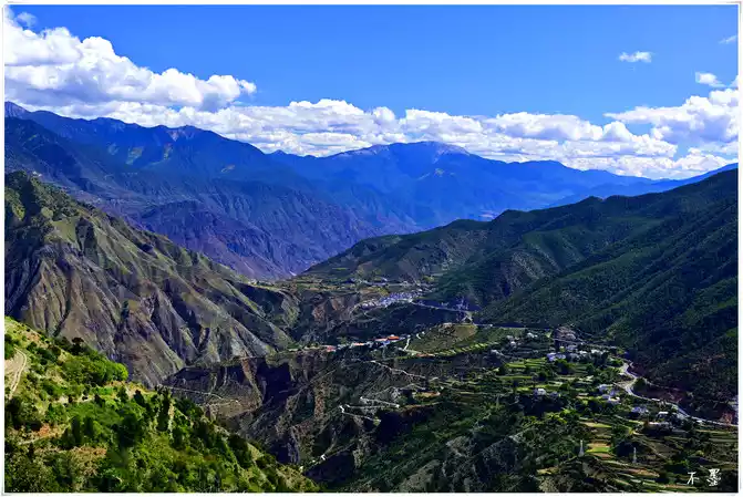 The road circles through the mountains, rising layer by layer from the bottom of the valley to the top of the mountain, small villages and temples are quietly scattered on the mountainside, and the mani piles on the side of the road silently bring blessings and good luck to those who pass by.