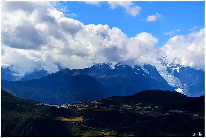 On the top of the mountain in the distance, under the white clouds and waves, the Meili Snow Mountain gradually revealed its true face.