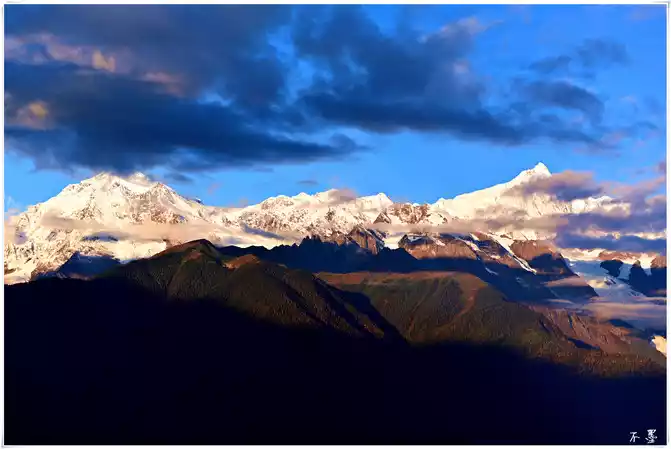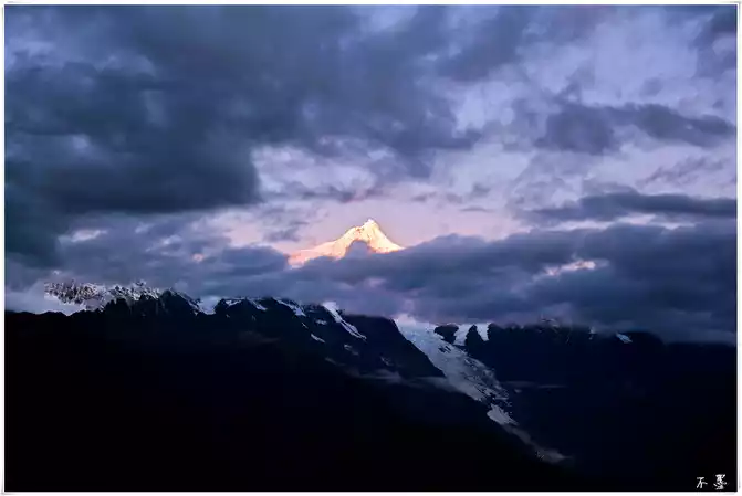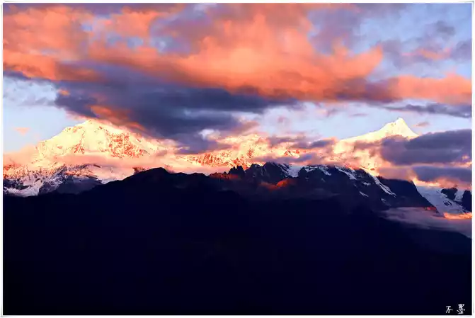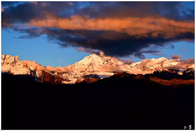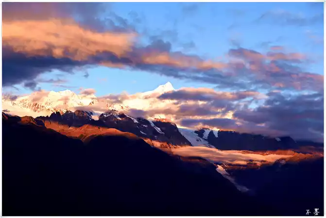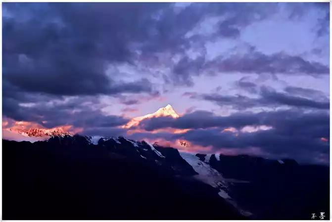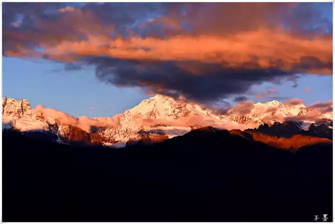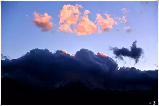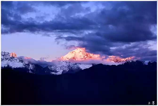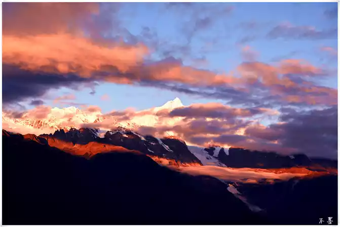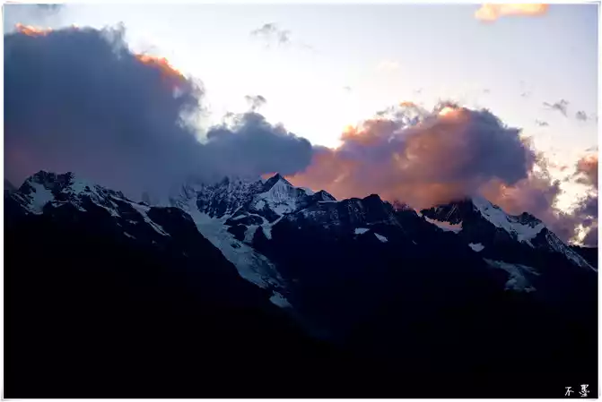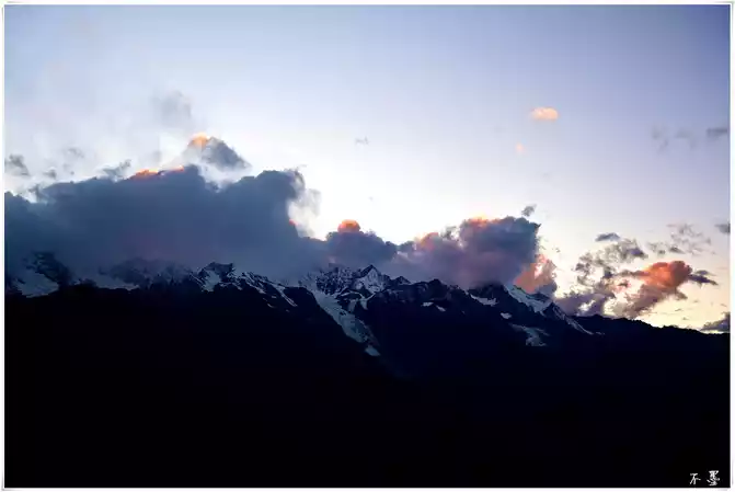 the sun sets, the rolling dark clouds gradually submerge the snow-capped mountains, and above the dark clouds, pieces of red clouds hang in the clouds, which seems to indicate that tomorrow will be a sunny day.