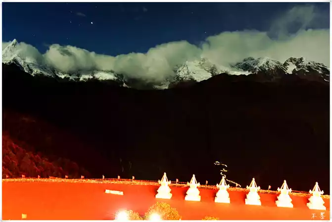 After dinner, we came to the roof platform of the inn, the crescent moon was in the sky, the clouds were not so thick, the snow-capped mountains were clearer than during the day, and the Kawagbo peak showed its spire.