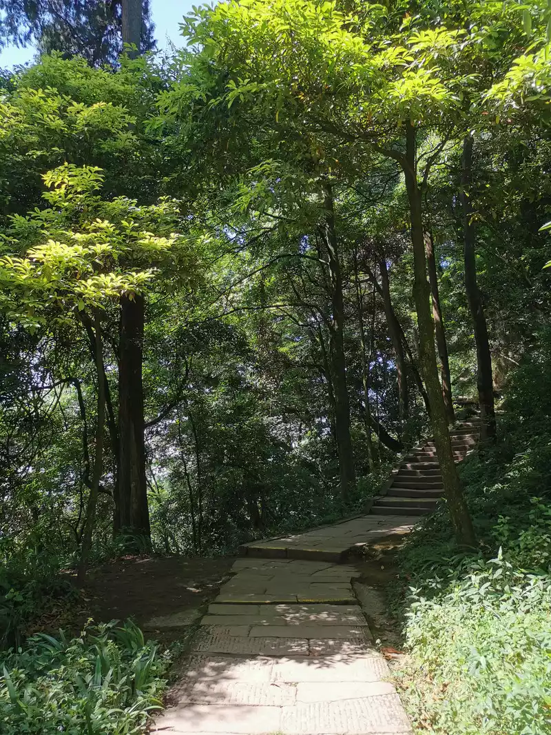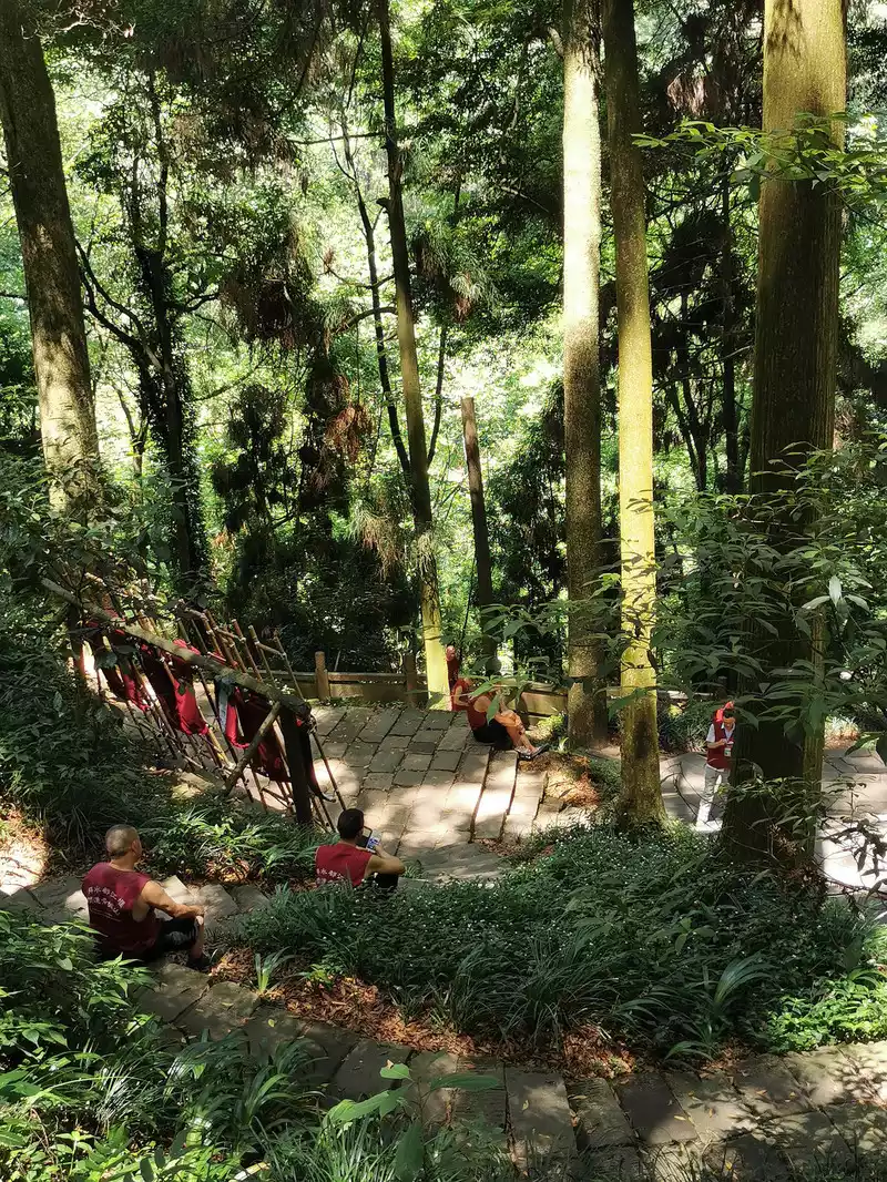 Thousands of trees are lush, green shade and sun, and the temperature outside the mountain is more than 30 degrees, and the mountains are cool and pleasant.