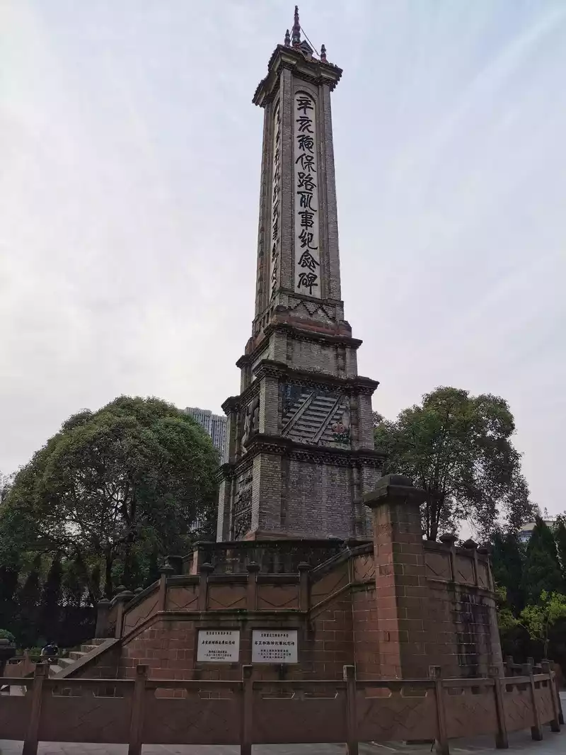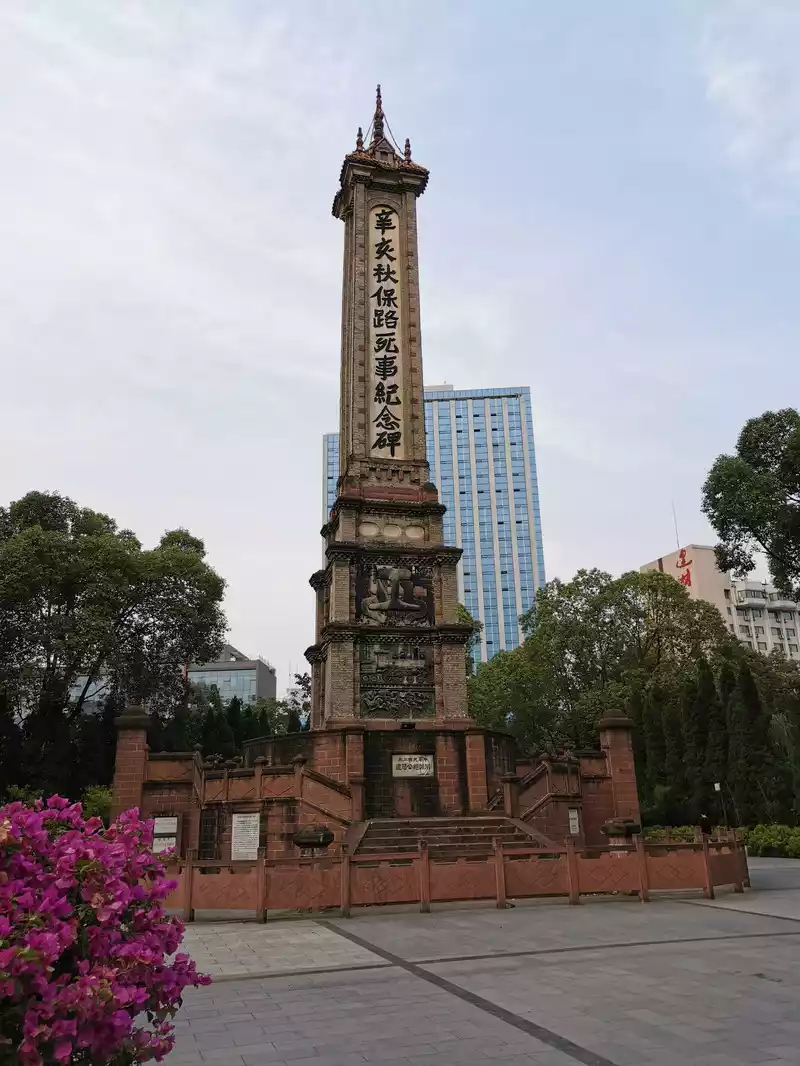The Xinhai Autumn Baolu Death Monument was built in 1913 to commemorate the compatriots who died in the Sichuan Baolu Movement in 1911 (Xinhai). The stele is located in the northeast and southwest, and consists of four parts: the stele platform, the stele base, the stele body and the top of the stele. The diameter of the round base is about 9.8 meters, the side of the obelisk is about 4 meters long, and the total height of the tower is about 31.85 meters. The stele is engraved on all sides in four fonts: regular script, grass, line, and clerical script.