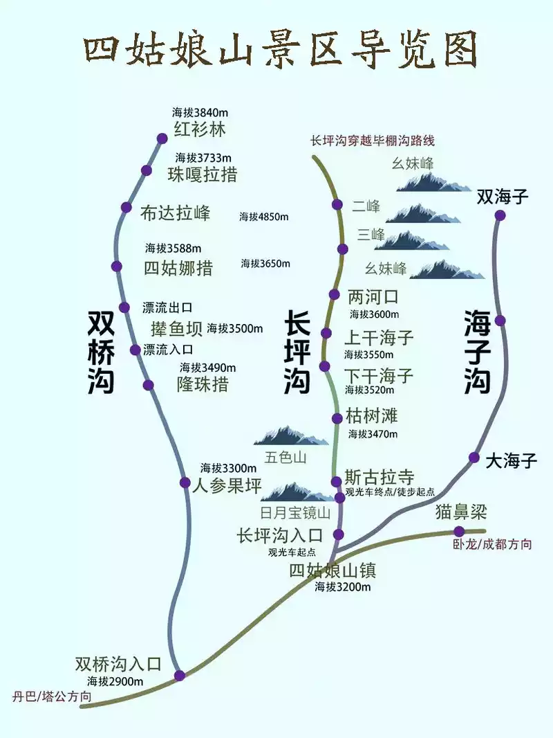 There is no need to worry about altitude sickness along the way, there are many green plants in the mountains, high oxygen content in spring and summer, Qingcheng Mountain is 1600 meters above sea level, and it will not be high; The altitude of Shuangqiaogou in Siguniang Mountain is 3200~3800 meters, and it is generally not high.