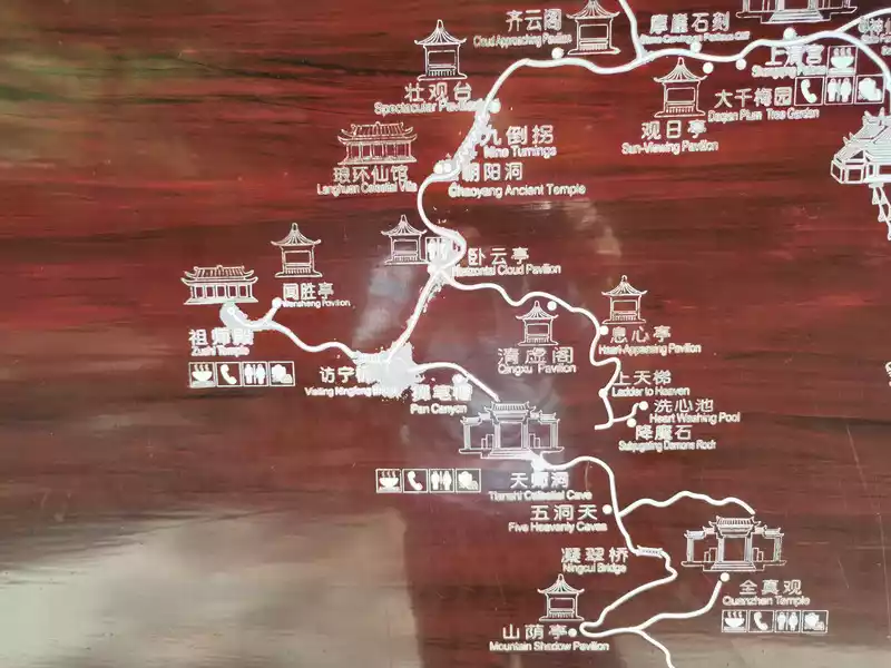My tour route in Qianshan Scenic Area: Shanmen → Natural Pavilion→ Yile Wo→ Yuecheng Lake → (Ascending Ropeway) → Ciyun Pavilion→ Daozi Wall→ Shangqing Palace→ Cliff Rock Carvings→ Spectacular Terrace→ Chaoyang Cave→ Ancestral Master Hall→ Visiting Ningqiao→ Throwing Pen Slot→ Quanzhen Temple→ Tianshi Cave→ Wudongtian→ Natural Pictures→ Yinsheng Pavilion→ Yile Wo→ Mountain Gate. Take the ropeway up, hike along the mountain road down, and circle the mountain counterclockwise.