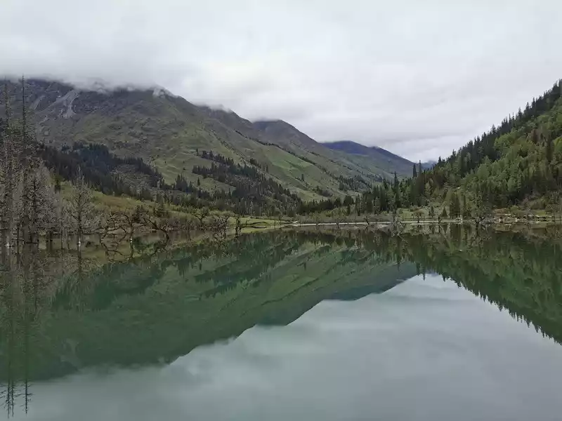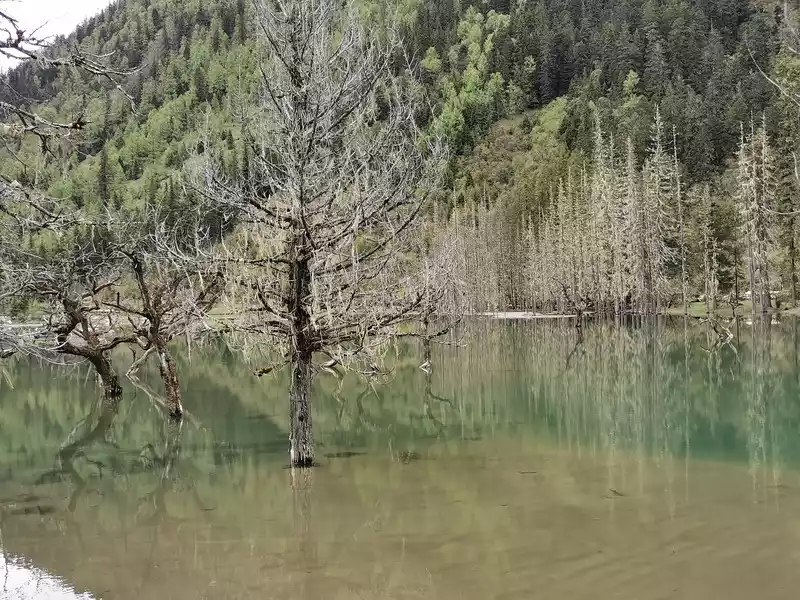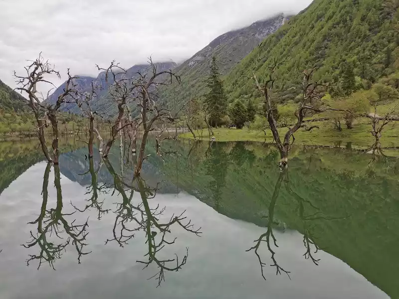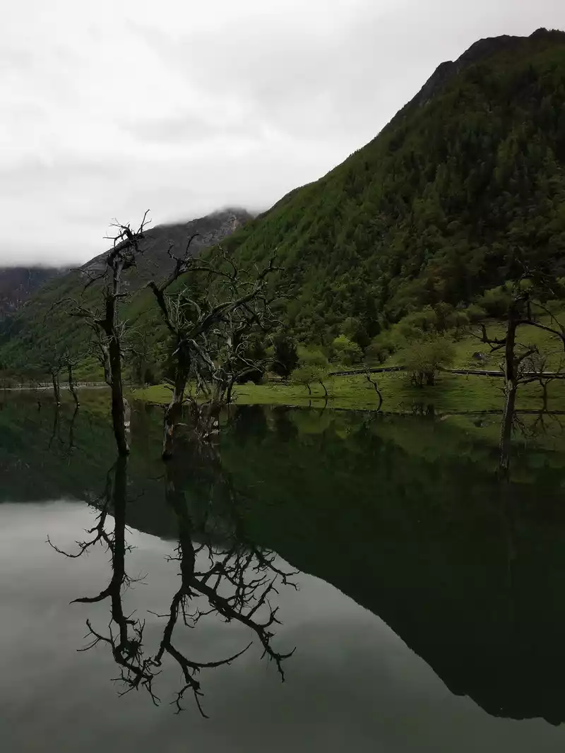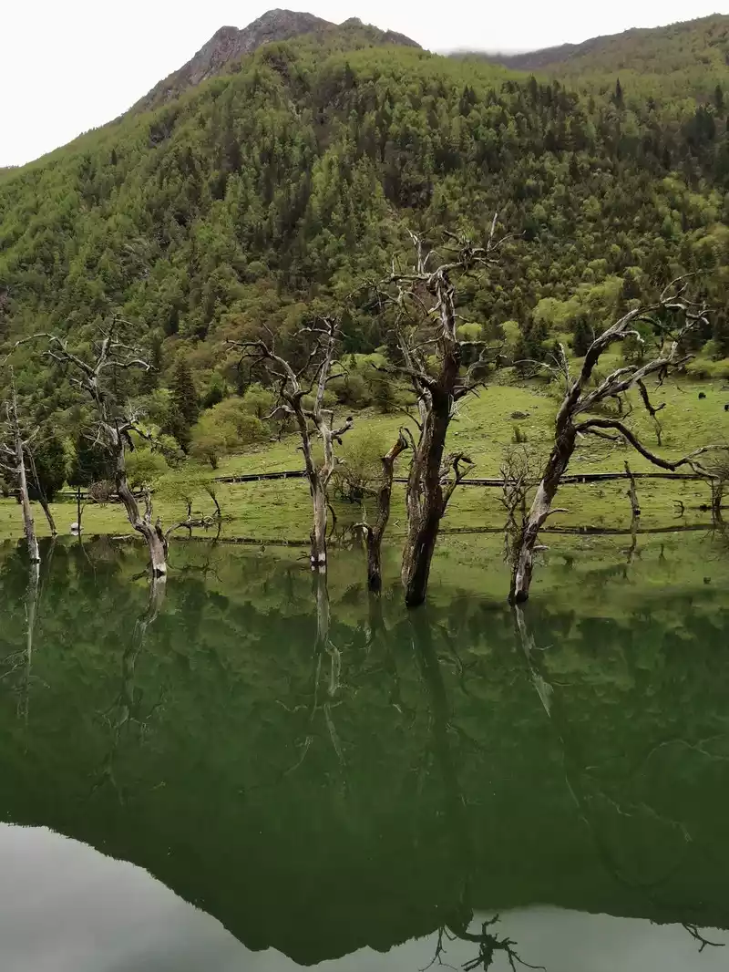 Sigu Nacuo is a dammed lake formed by the debris flow of the Wenchuan earthquake on May 12, 2008. The lake water here is crystal clear, and the reflection of dead wood is clear, like a mirror in the sky.
