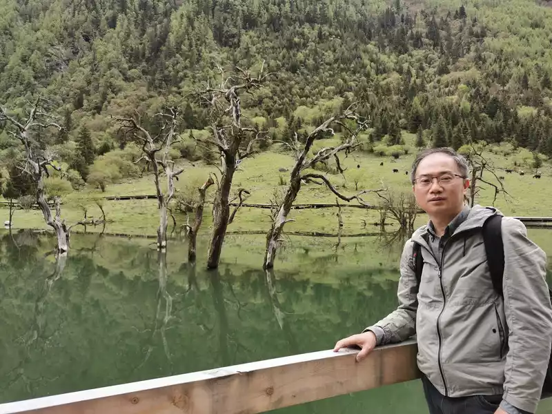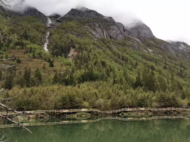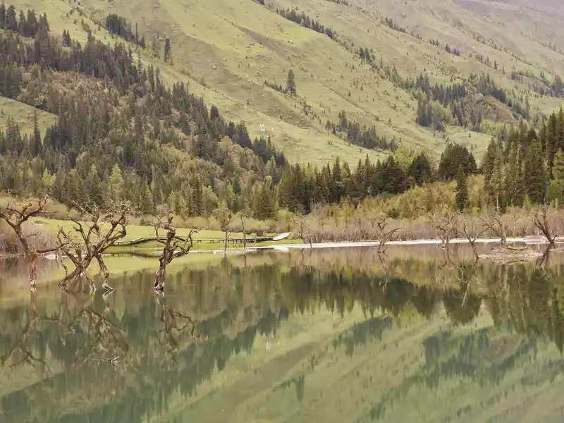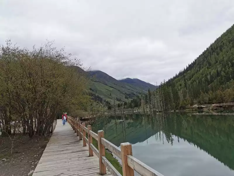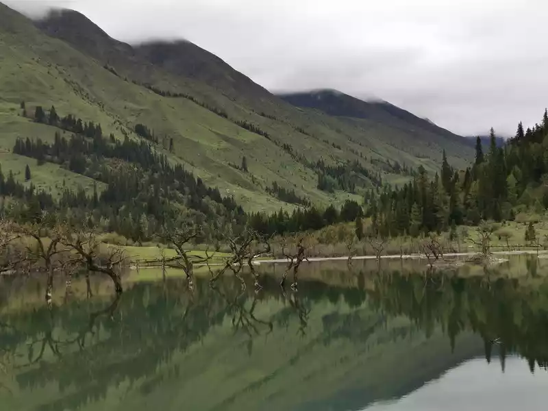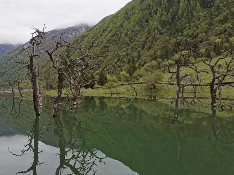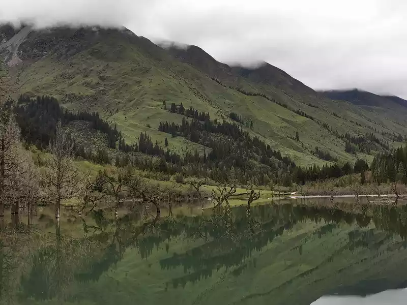Sigu Nacuo is a dammed lake formed by the debris flow of the Wenchuan earthquake on May 12, 2008. The lake water here is crystal clear, and the reflection of dead wood is clear, like a mirror in the sky.
