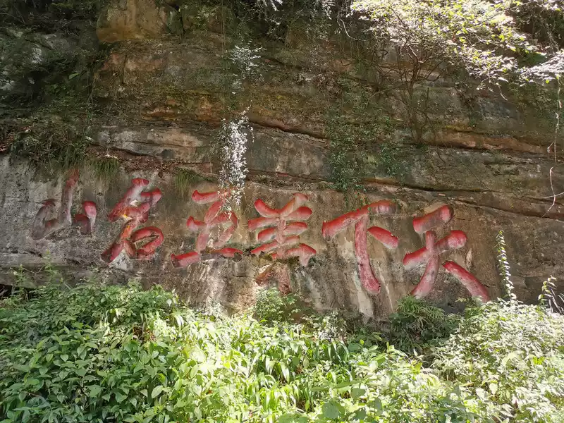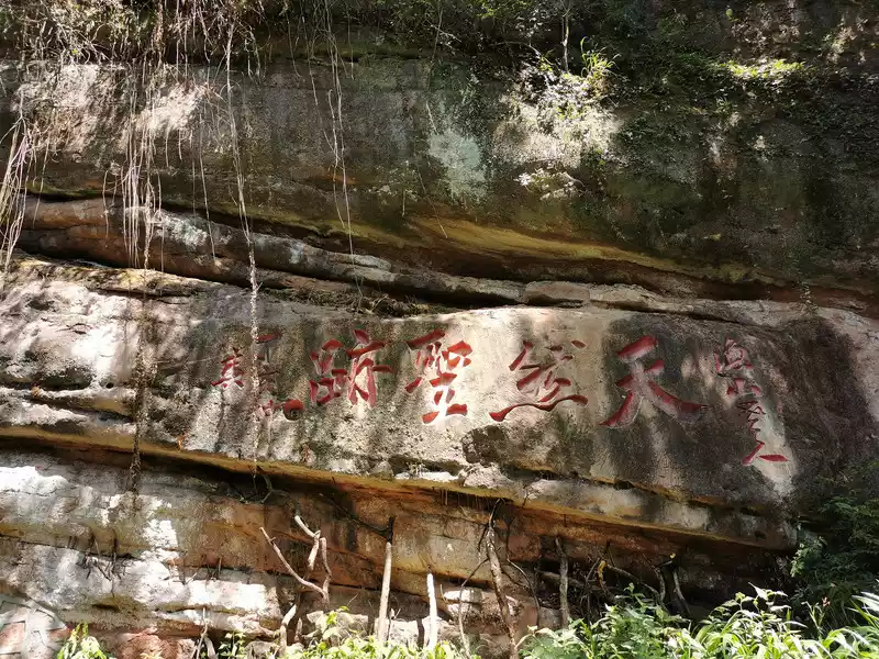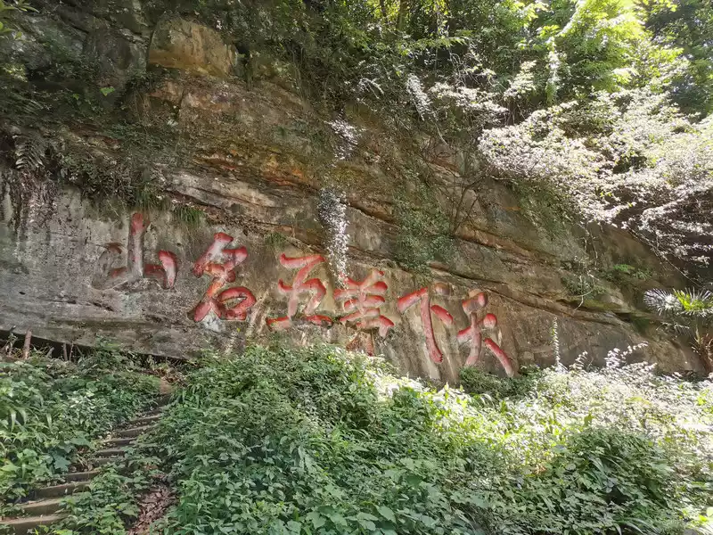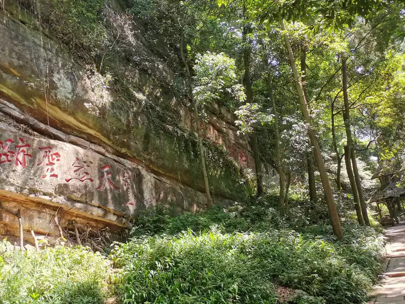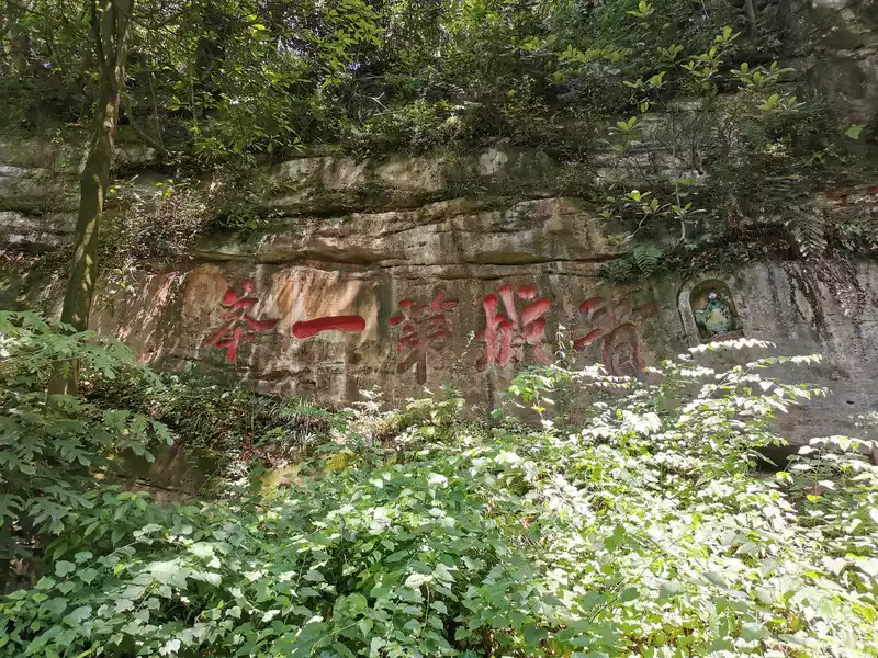 The cliff carved "the fifth mountain in the world", "the first peak of Qingcheng", and "the natural holy site"