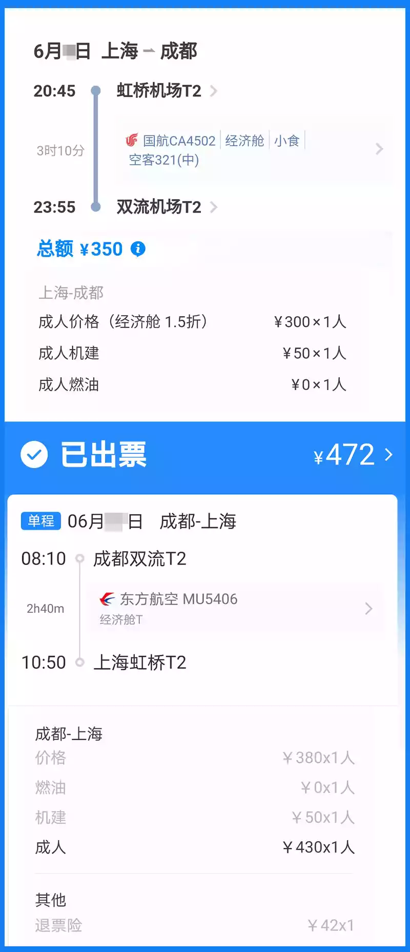 During the epidemic prevention period, the plane ticket is really cheap, more than 3,600 kilometers round trip from Shanghai to Chengdu, the round-trip ticket is less than 800 yuan, and the train ticket is more than this price.
