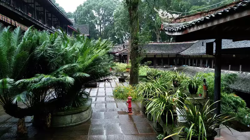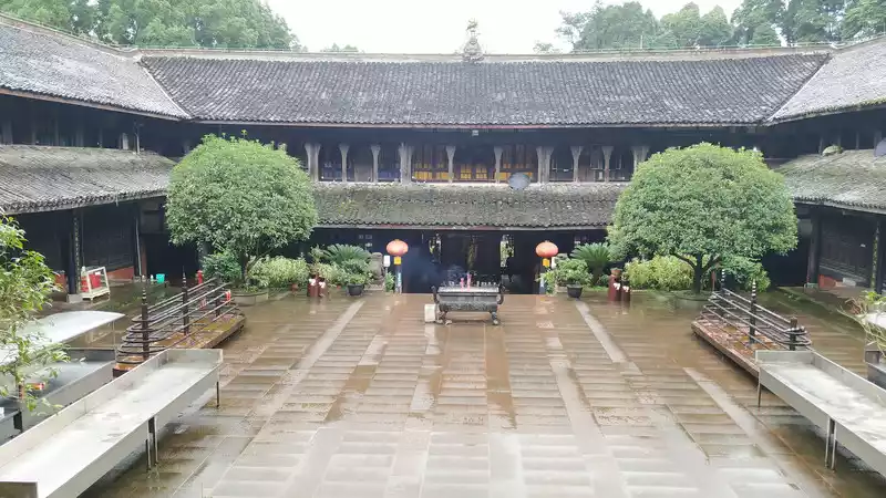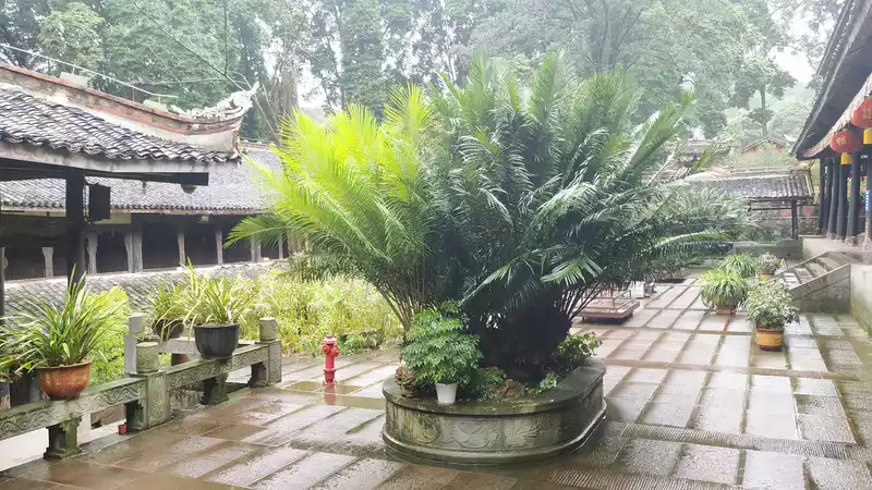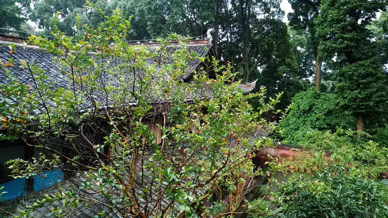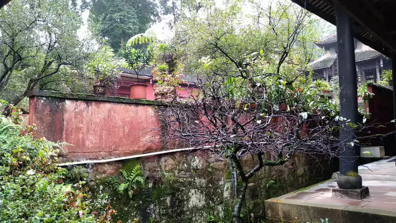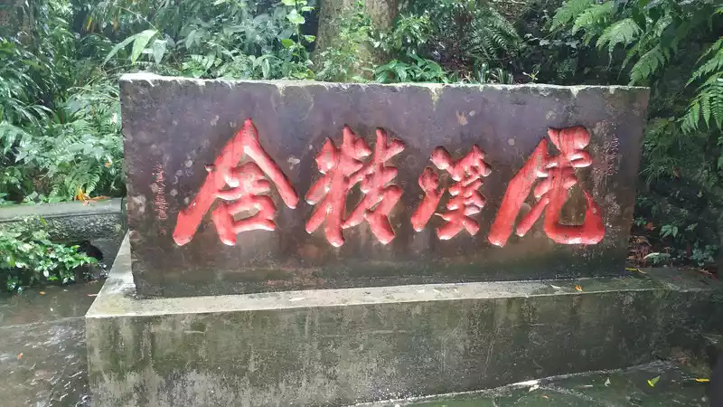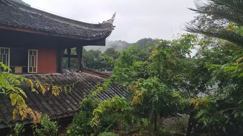 Fuhu Temple is not too far from Baoguo Temple, but it is very difficult to find in the rain. When I was hesitating whether to continue moving forward, I suddenly saw the stop sign of the roadside bus stop: Fuhu Temple. All the way forward, the rain gradually decreased, crossed a mountain stream, walked through a path, and arrived at the gate of Fuhu Temple when the rain was about to stop. There is a stone tablet in front of the door, which reads: Tiger Creek Jingshe. According to legend, tigers often appeared here to hurt people in the past, and were later ambushed by eminent monks, hence the name. The scale of Fuhu Temple is not small, and the ancient temples are staggered due to the terrain.