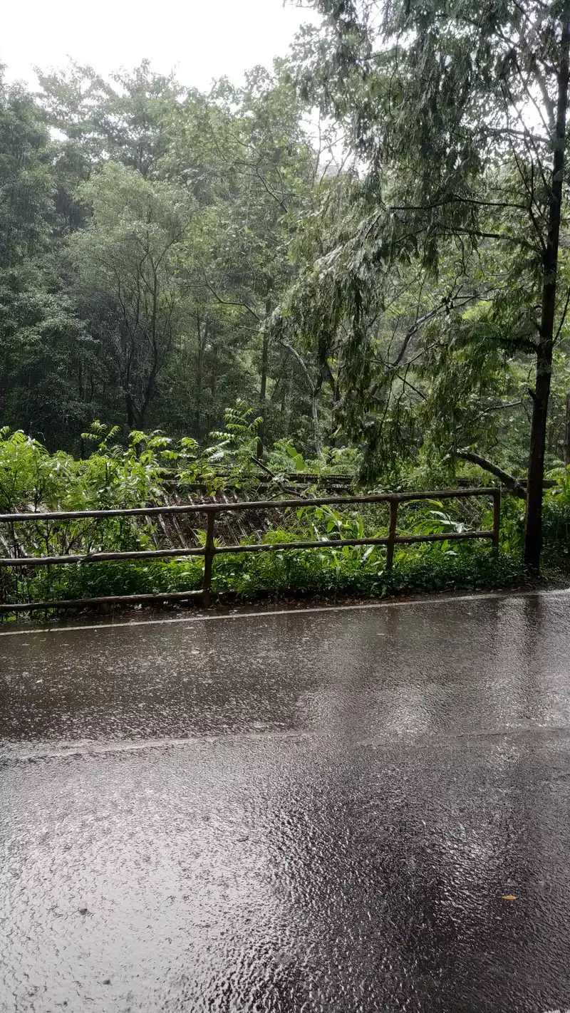 Coming out of the Baoguo Temple, the rain fell even heavier. On the way from Baoguo Temple to Fuhu Temple, there was not even a place to take shelter from the rain, so I had no choice but to go along the road. The trees on both sides of the road are lush, blocking the sun and covering us from the rain. The road is surrounded by foothills on one side and valleys on the other. The water in the valley was very strong, surging down. Because it was going to a higher place, the rain flowed down the road, and the shoes were already soaked. Fortunately, there were frogs jumping around on the side of the road in the rain, which calmed the children's emotions.