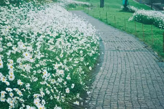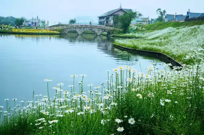 Hold an umbrella, stroll along the flower path, breathe the pure natural oxygen at 30° north latitude, admire the vigorous white chrysanthemums, and feel a comfortable journey of separation.