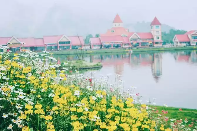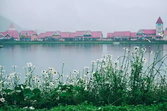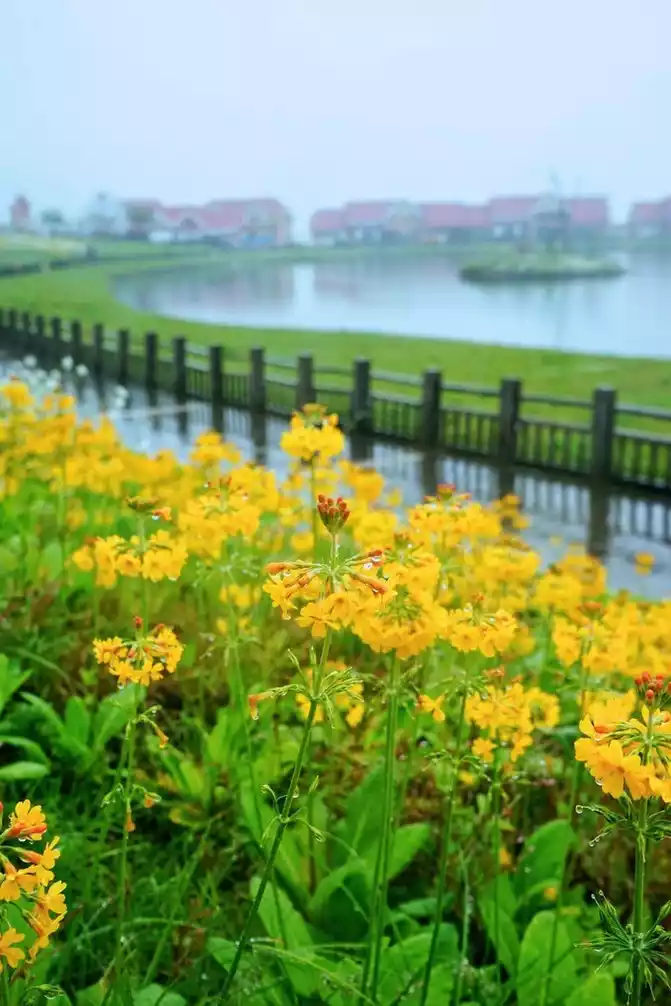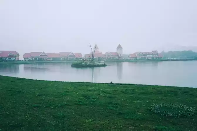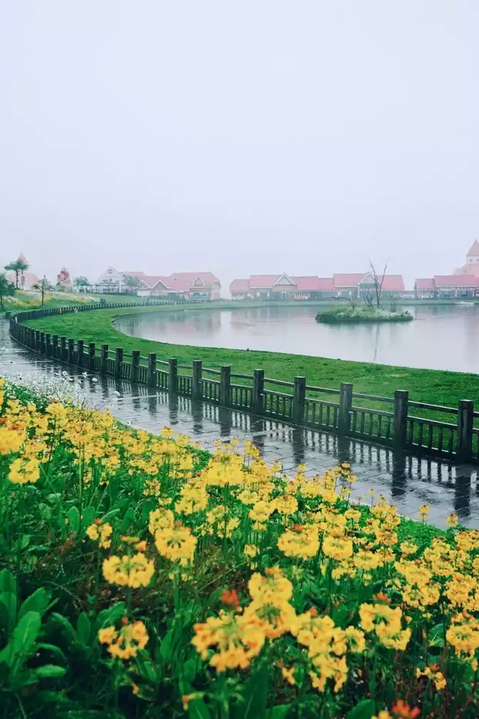 The sky is still drizzling, the lake water is particularly transparent, and the shadows of the buildings in the distance are reflected in the water, as if you have come to a paradise.