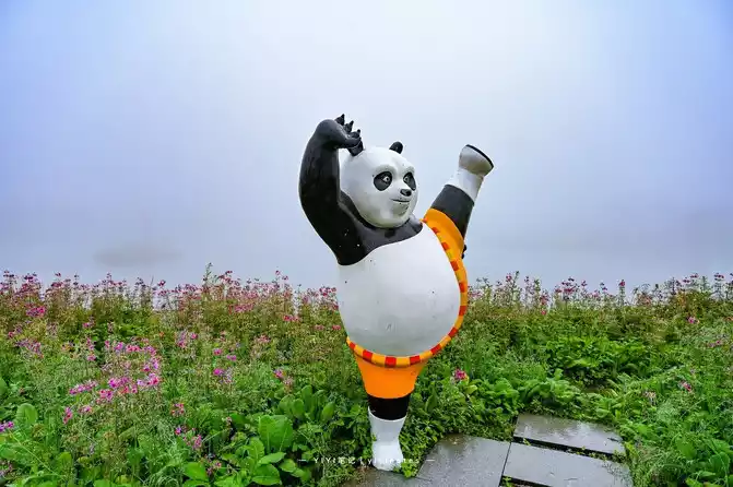A corner of the sea of flowers where the cute kung fu panda stands, many children love to come here to take photos with it, and the more cute it is, the more cute it is.