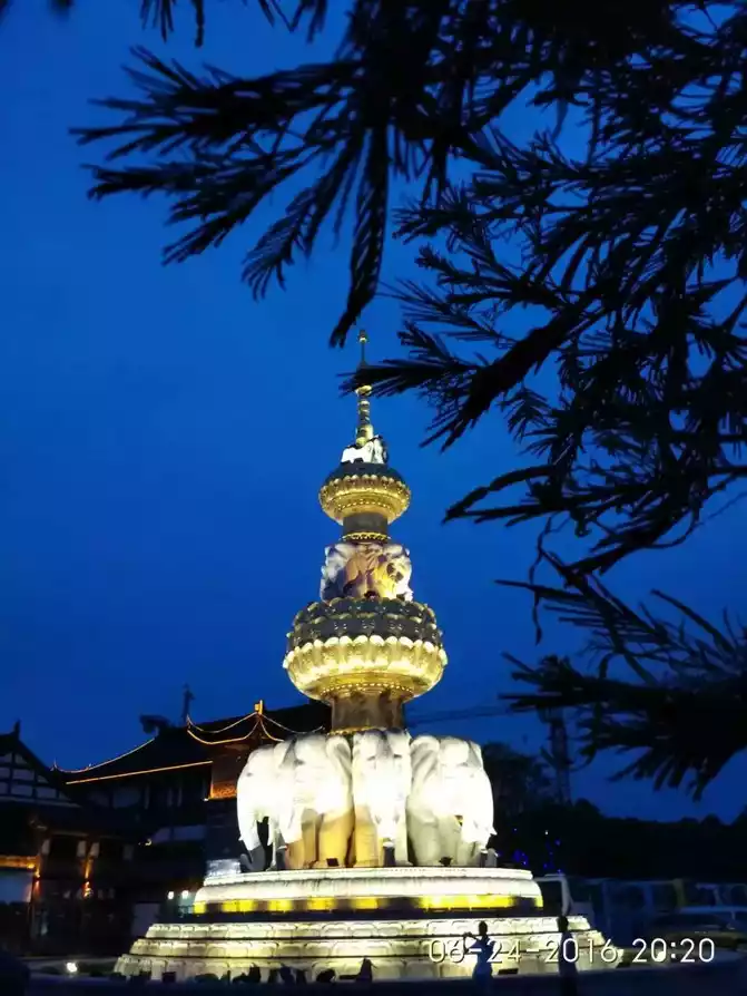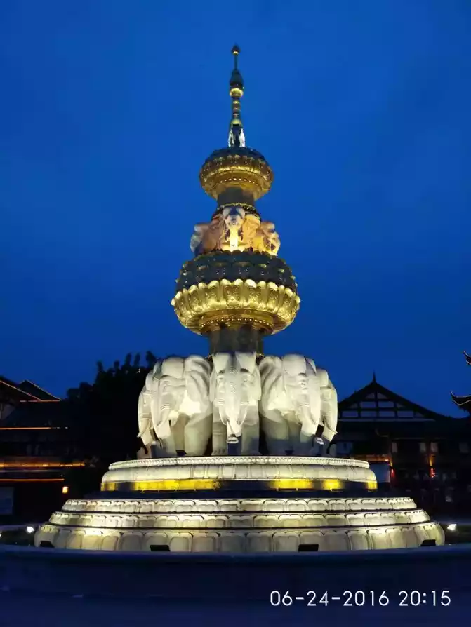 Emei Elephant City is located in the city of Emei Mountain, close to the largest Buddhist temple in China, the Big Buddha Monastery. After we arrived there, it was already four o'clock in the afternoon, so we first visited the Big Buddha Monastery, went back to the hotel for dinner, and then went to visit the night view of Elephant City. Emei Elephant City covers an area of 67 acres, consisting of garden buildings, and the architectural style is simple and magnificent. An elephant tower on Elephant City Square left a deep impression on Ali: a pagoda consists of three layers of lotus platforms and three layers of elephants, the first layer is a white lotus platform with eight white elephants with their heads facing outward, the second layer is a golden lotus platform with four white elephants with their heads facing outward, and the third floor is a golden lotus platform with two white elephants with their heads facing outward. Under the illumination of the lights and against the backdrop of the blue sky, the entire elephant tower shone brightly, making Ah Li can't help but stop and take a closer look.