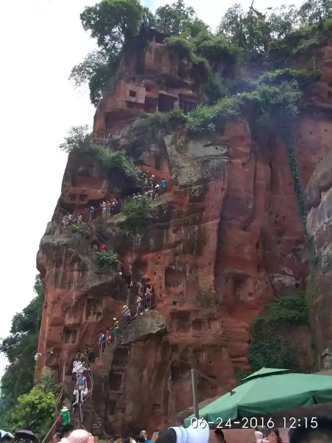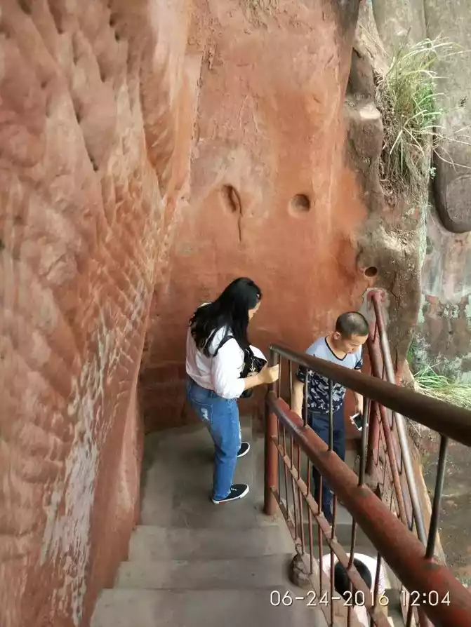 We arrived at the scenic spot at eleven o'clock, which was the time when there were the most tourists, and everyone could only line up and slowly descend from the nine-curve plank road on the right side of the Big Buddha. The Jiuqu plank road built on the cliff is a one-way road, which was left over from the excavation of the Giant Buddha in the Tang Dynasty, twisting and turning, very narrow, we can only walk slowly down one by one by holding on to the fence, and watch the Big Buddha on the left while walking. There was some green grass and moss on the bun and body of the Big Buddha, and the parts of his face were also a little black due to rain erosion, but all this did not affect the demeanor of the Big Buddha at all - it was still so dignified and solemn, which made people feel awe.