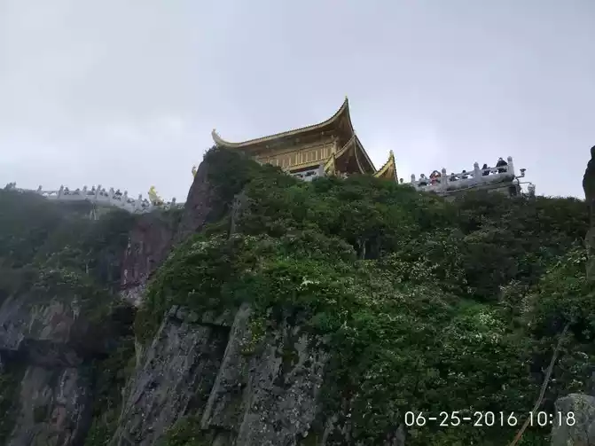 The sacrificial cliff on the east side of the Golden Dome also made Ah Li linger. At that time, the Sacrifice Cliff only had low, simple guardrails, and we could stick our heads out of the guardrails and look down at the abyss below and the mountains in the distance; you can also look up and see the blue sky and white clouds; You can also look back and stare at the golden hall on the cliff. The part where the Sacrifice Cliff protrudes is called King Kong Mouth, which is the best viewing point of the Golden Peak, but it is also the most dangerous place. However, some tourists were not afraid and even climbed over the guardrail and took pictures on the edge of the cliff. Some people even sacrificed themselves here and flew into the sea of clouds, making the Sacrifice Cliff a key place for the staff of the scenic spot.