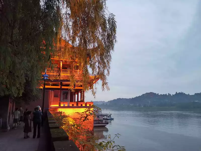 In an alley next to the "New and New" theater, I found a noodle restaurant called "A Bowl of Good Noodles", and I ate one for 12 yuan (8 yuan for a small portion, 12 yuan for a large portion) Sichuan ·" "Burning noodles", that noodle and that taste are different from the "burning noodles" in our mainland. I feel that once I enter my throat, the rare "choking, numbness, spiciness, and fragrance" is definitely enough to taste and enjoy! To this day, it still has an endless aftertaste. After the meal, I took a walk along the confluence of the three rivers on Binjiang South Road. At this time, the Giant Buddha of Lingyun Mountain in Leshan on the other side of the Min River was also lit up.