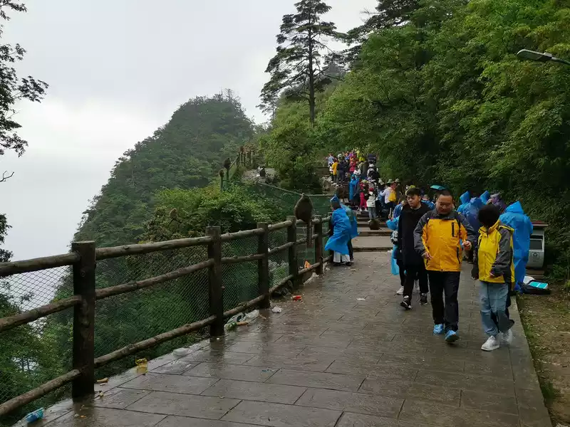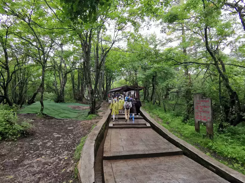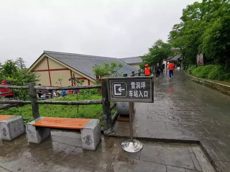 From the Emei Mountain Passenger Transport Center to the Leidongping parking lot is 62 kilometers, the mountain road is winding, the speed limit is 40 highways, and the journey takes about 2 and a half hours. When the bus arrived at Leidongping, it rained heavily, and the weather was very cold, and people were busy renting coats to keep out the cold. From Leidongping to the Golden Ding Cable Car station, you must also hike a 1.5-kilometer mountain road, which is close to 3,000 meters above sea level, and for tourists with high reactions, you must be mentally prepared.