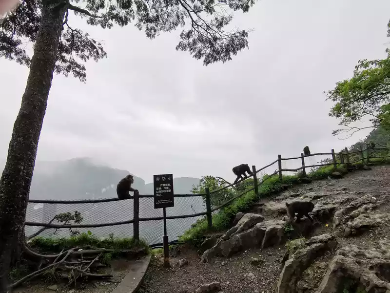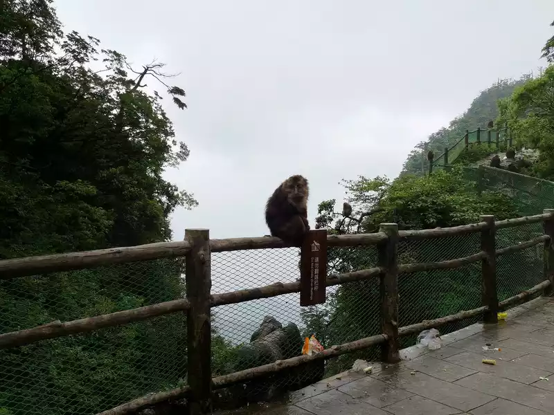 way to the misty rain, all the way hazy, the road to see the scenery and the monkeys. In about 30 minutes, I walked from Leidongping to the lower station of the Golden Dome Cable Car, a place called the Jieyin Hall.