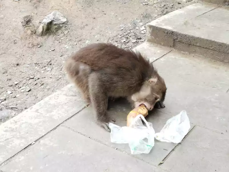 In order to prevent macaques from hurting people, the special personnel of the scenic spot strictly supervise the macaques here and try their best to prevent the macaques from pestering tourists. Tourists are also asked not to play with macaques, feed on macaques, and urge tourists to enter and exit the lot through the macaques as soon as possible to reduce accidental injuries. However, there are still macaques who are "bold", taking advantage of the caretaker's caretaker to quickly carry out "roadblock robbery", and these "attackers" are skilled in their routines, and they will not "fail" in general.