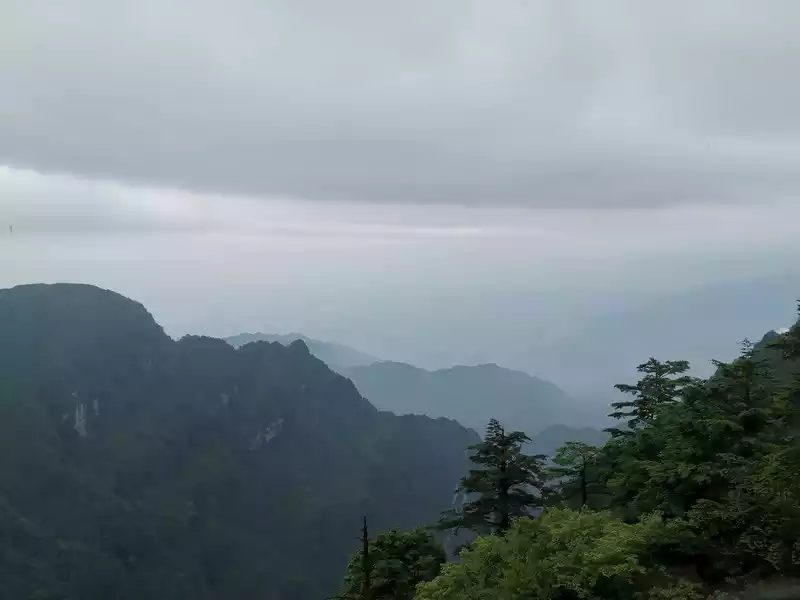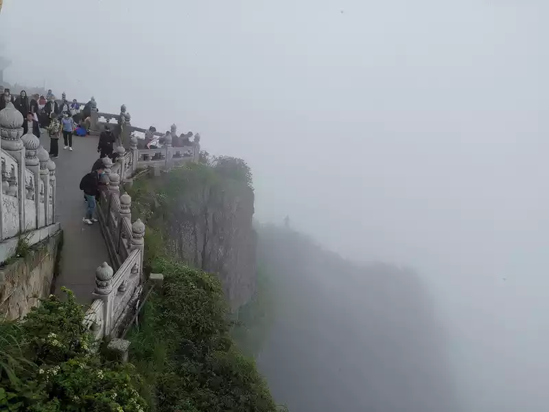 On the east side of the Golden Peak, there is a cliff suspended more than 600 meters in the air, which is majestic and magnificent, called the Sacrifice Cliff. Here you can see the "Buddha's Light", "Magic Lamp", sea of clouds, sunrise, so it is also called the Light Terrace. Whenever the sky is high and the clouds are light, the jade universe is clear, here you can see the sky, the clouds are vast, as far as the eye can see, look at the high mountains of Emei, see the towering Gongga Snow Mountain, look at the tortuous circulation of the three rivers, look around the Chengdu Plain, look at the mountains of the big and small, and see the mountains and rivers so delicate! It's a pity that today I can't see anything except the hazy Emei!