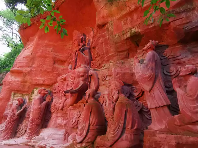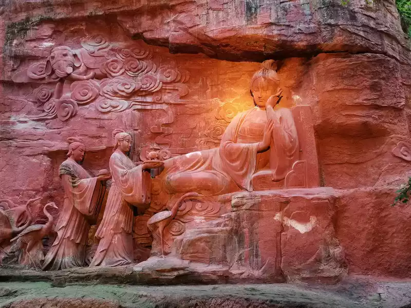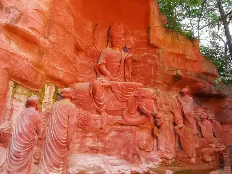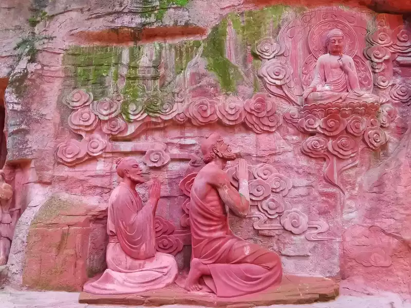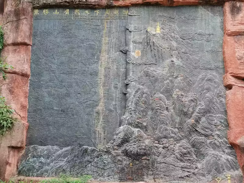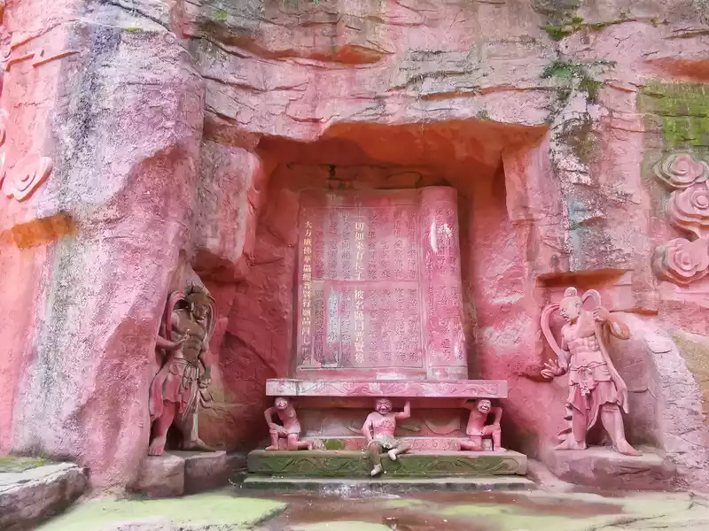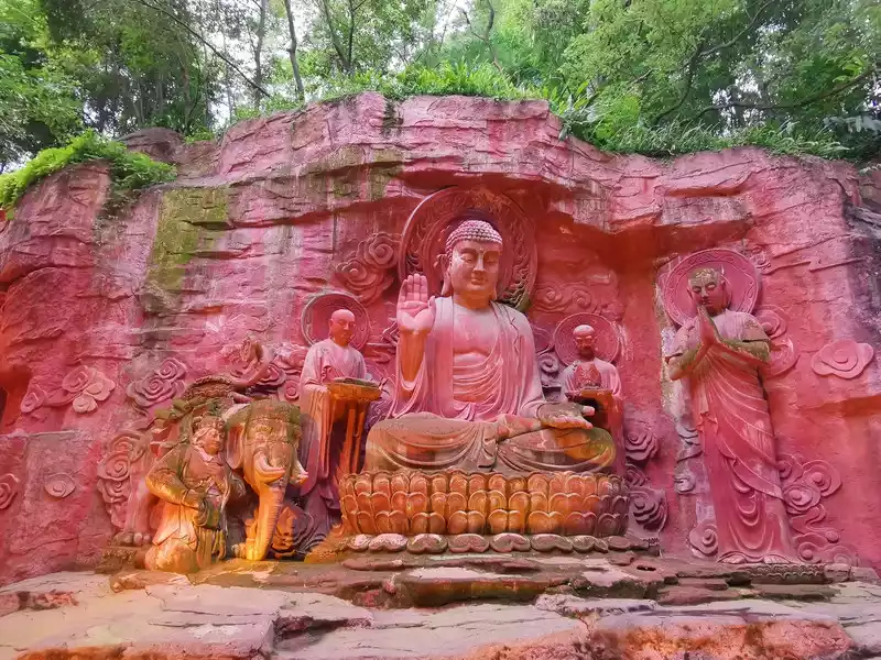 One of the grand scenery of Emei, the large grotto mural statues in front of the Baoguo Temple, each character is lifelike, the carving skills are exquisite, and it has extremely high artistic appreciation value. Each picture here represents a Buddhist historical story about Mount Emei.