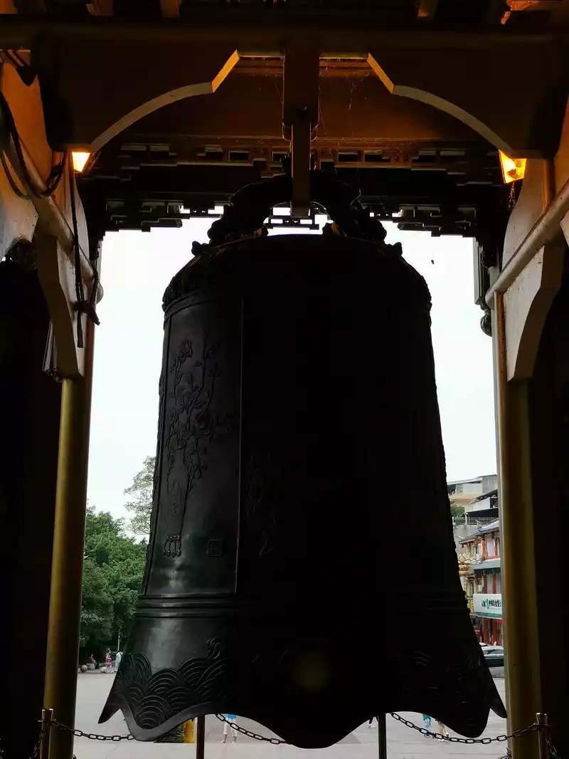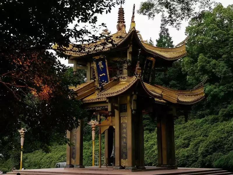 The "Holy Evening Bell" in front of the Baoguo Temple is one of the grand scenery of Emei. This bell was cast during the Jiajing period of the Ming Dynasty by the Huguang monk Bechuan Zen Master. The bell is 2.3 meters high, 2 meters in diameter, and 10 cm thick in walls. Weighing 12.5 tons, it is the largest bell in the entire Emei Mountain. A coiled dragon is cast at the top of the large bell for hanging.