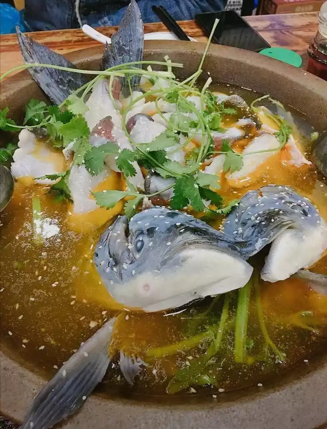 Thereare three flavors of the bottom of the pot, classic red pot, ancient sauerkraut pot, and lemon ginger pot (if you don't like spicy food, you can choose lemon ginger pot). The waiter brings a pebble iron pot burned to more than 300 degrees Celsius, puts in the cut fresh fish fillets, pours in the broth, covers for a few minutes and enjoys. The fish fillets cooked from pebbles, paired with special fish and butterfly ingredients, are tender and smooth, and extremely delicious.