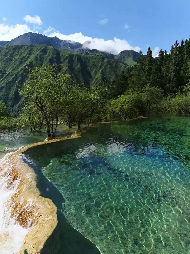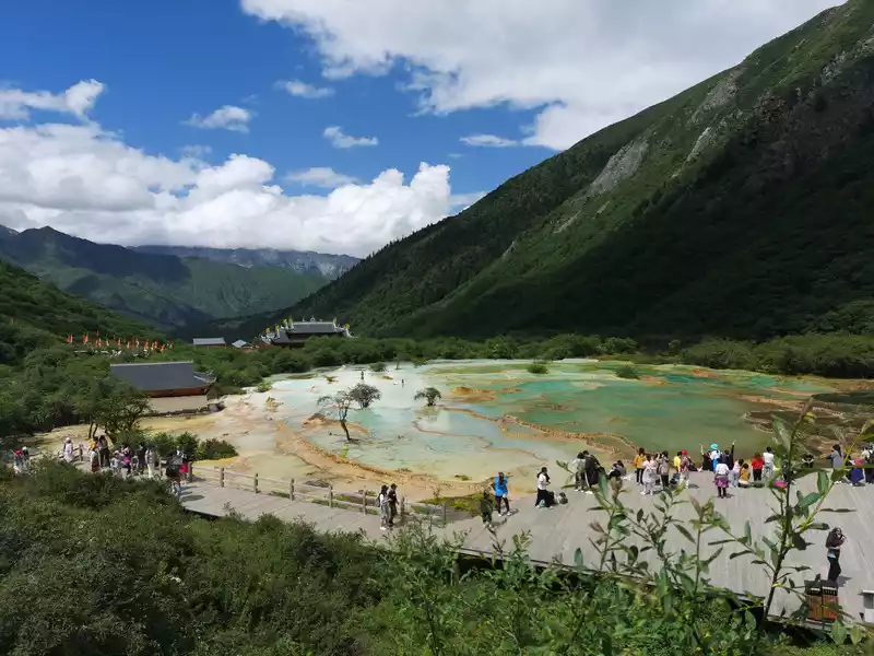 Considering the high altitude of Huanglong, I originally planned to go to Chuanzhu Temple to rest and adapt first, and then go to Huanglong tomorrow, but the weather today was simply not too good, and I decisively decided to play Huanglong directly and then go to Chuanzhu Temple, the scenery of Huanglong seems to me to exceed Jiuzhaigou (personal opinion only), and it may also be because of the good weather. The yellow dragon is really like a huge yellow dragon, and countless large and small calcification pools are like colorful dragon scales under the sunlight, and the feng shui is very good.