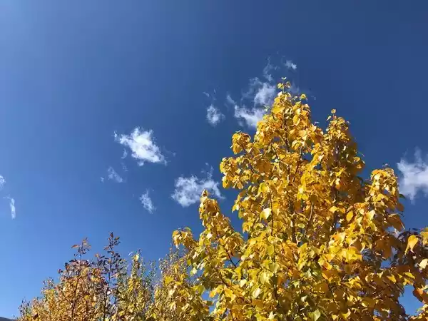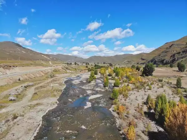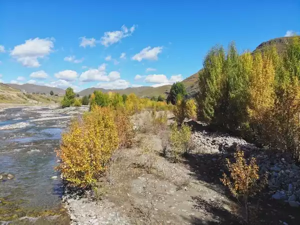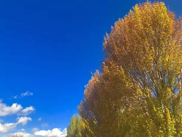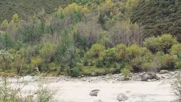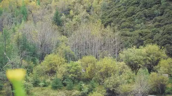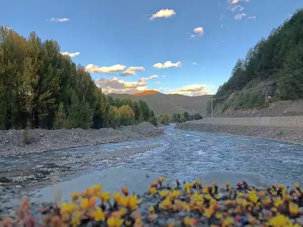 on the banks of the Daocheng River, the sun shines on a large area of poplar forest, and there