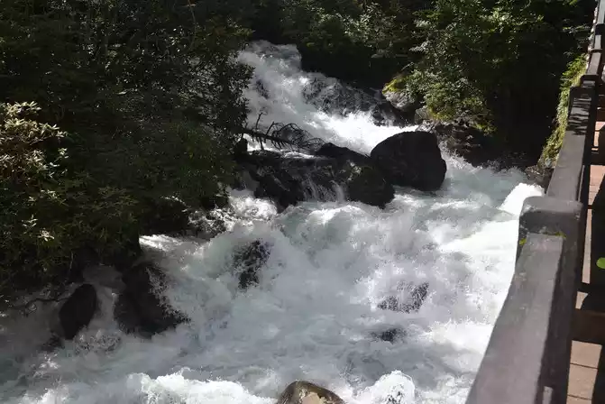It takes about 30 minutes to take the scenic sightseeing bus from the ticket office directly to the top of the mountain. Listen to the tour guide explain the poignant love story of Tashi and Dolma on the bus. Mugecso is the largest mountain lake in northwest Sichuan, with an altitude of 3,780 meters. Take a car to the lake at the top of the mountain, take pictures and enjoy the lake and mountains, you can also take a boat tour of the lake, and then walk down the trail, passing by the Meditation Pool, Rhododendron Gorge, Medicine Pool Boiling Spring, Waterfall Group, Seven Colors Sea, Sandie Spring, Welcome Stone, Songluo Viewing Area, etc. are all excellent attractions. Due to the large drop, the water rushed down and thousands of horses galloped. There are many wild mushrooms on both sides of the trail along the way, and we are not locals who dare not pick them, but many of them can be seen in front of the restaurant. It is about 8 kilometers from the top of the lake to the Seven Colored Sea, and it takes about 3 hours. The boiling spring of the medicine pool can soak our feet, due to time constraints, we did not stop, we went directly to the Seven Colors Sea Restaurant for lunch, and after lunch, we took the scenic sightseeing bus back to the foot of the mountain. Then drive to Ya'an.