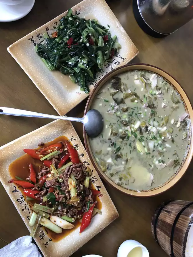 After visiting the panda base, when we came out, we consulted the handsome guy at the ticket gate about the restaurant where the locals were eating, and he introduced the Liu Sange Hongyun Restaurant in the town, and from the base to National Highway 350, it was about 150 meters in the direction of Siguniang Mountain.Sure enough, it's a good restaurant, there are locals eating the wedding banquet, we ordered sauerkraut elbow, pickled pepper beef and greens, the taste is very good, the price is affordable. Leaving the restaurant, we continued to move forward along Panda Avenue towards Siguniang Mountain, increasing in altitude and going uphill all the way. There are high mountains on both sides of the road, the water at the foot of the mountain is panting, and the mountain is shaded by green trees. After crossing the mountains and passing through the tunnel, we arrived at the hotel in Changping Village, Siguniang Mountain at around four o'clock in the afternoon. After checking in, we found a nearby restaurant for dinner and then went back to the hotel to rest.