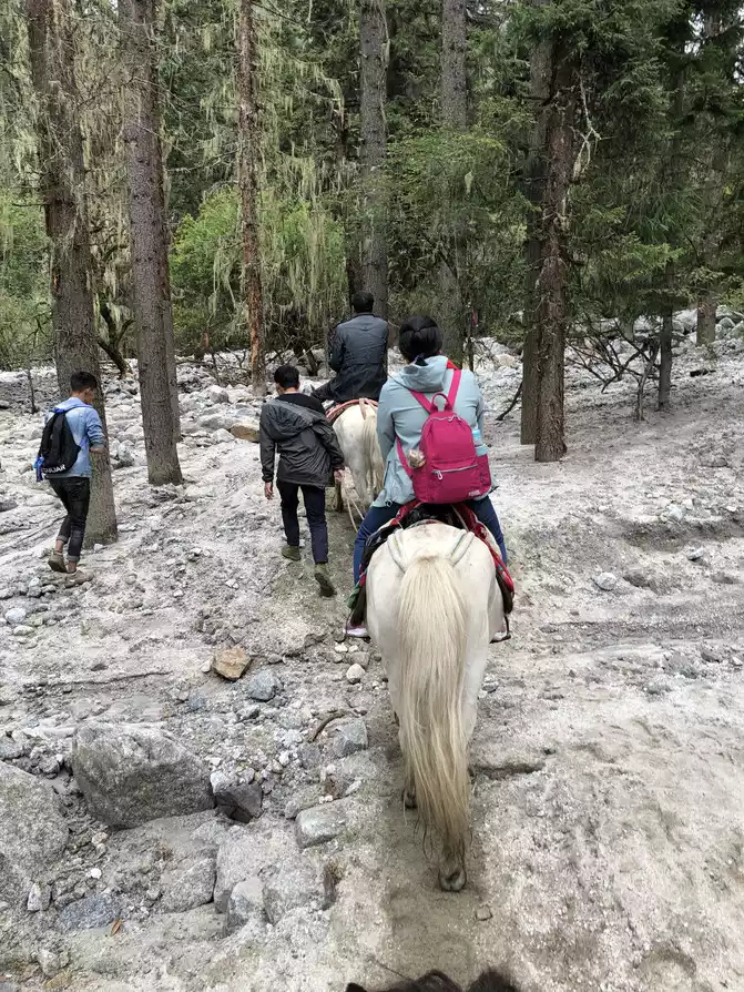 After breakfast at the hotel, walk to the ticket office in Changpinggou, book tickets online without picking up tickets, and directly swipe your ID card to take the sightseeing bus of the scenic spot to enter the scenic spot. The ticket office is about 8 kilometers to the scenic spot, take the scenic sightseeing bus to enter the scenic spot, and after getting off the bus, there is a plank road about 8 kilometers long. At the end of the plank road is a dirt road, which is more difficult to walk, and ordinary tourists will not continue to move forward, so they can choose to ride horses to the foot of Siguniang Mountain, which is relatively expensive. Some donkey friends who hike or climb will continue to move on, and they will need to purchase a separate hiking ticket and register. At the end of the plank road, you need to return the same way, of course, you can also consider riding a horse back, riding a horse needs to be charged separately, the cost is about 150 yuan/person.