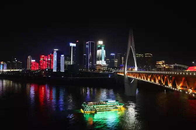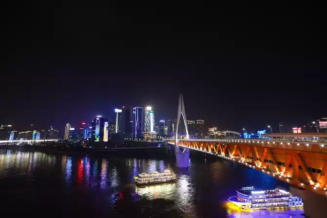 On the top floor of Hongya Cave, you can see the beautiful scenery of the Yangtze River and the Jialing River. When the time comes to night, the light of various lights on the river is the most beautiful scenery here. The cruise ship passes by, and the cruise ship with lights breaks through the river, which is also a beautiful scenery.
