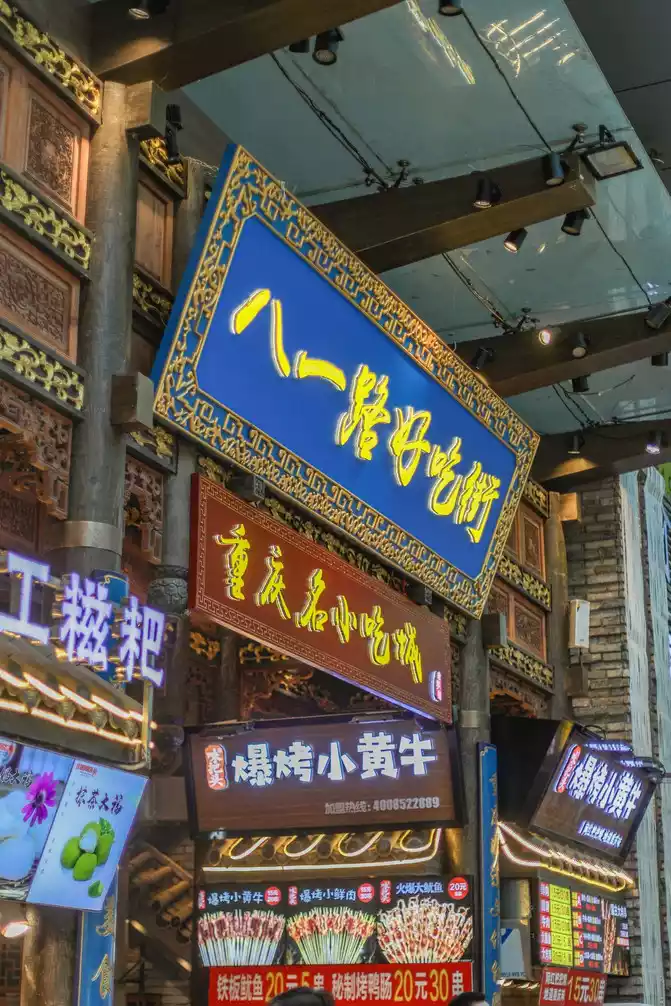 In Jiefangbei Pedestrian Street, there are also special snack streets. The decoration of the snack street is quite retro, and the red lanterns in front of the door and the various sculptures on the walls have a traditional taste.