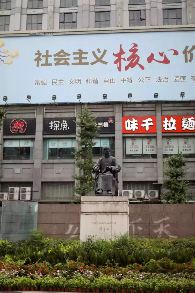 And in the pedestrian street, there are many interesting sights to see. Many bronze statues are placed here, from the bronze statues of the Republic of China costumes to the bronze statues of Mr. Sun Yat-sen. The bronze statue also constitutes the taste of the past, plus the copper plates inlaid on the floor, which have a historical flavor and wind and frost, and a little cyan copper sculpture is very historical.