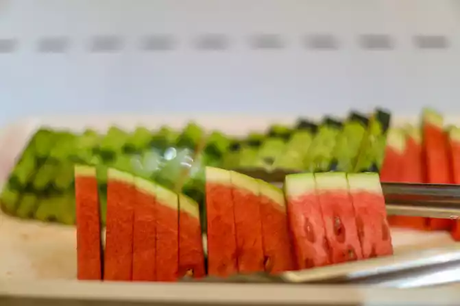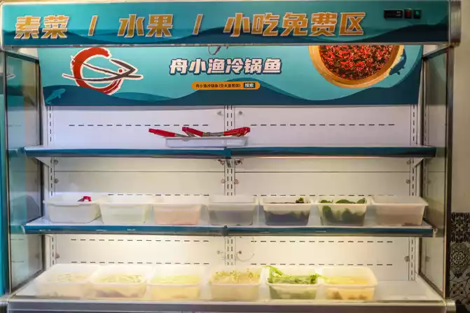 After eating the meat, boil the hot pot again and add a variety of fresh vegetables. Here all the vegetables are placed in an open freezer for self-pickup. Whether it's crunchy green bamboo shoots or sweet white radish, it's perfect for the bottom of the pot. Finally, a free watermelon is a little happiness after the meal.